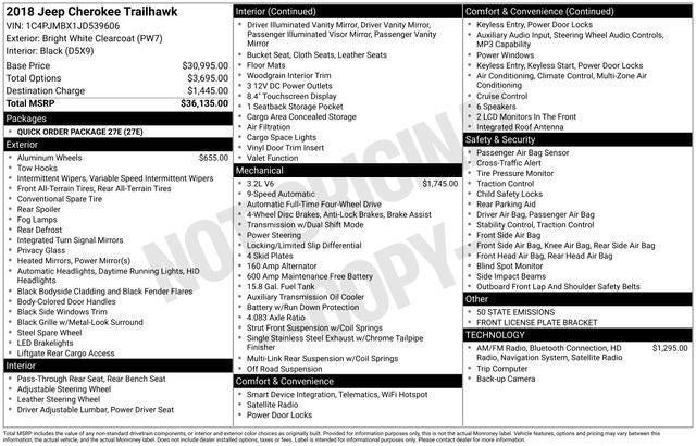 Bright White Clearcoat 2018 Jeep Cherokee Trailhawk 4WD 9-Speed Automatic 3.2L V6