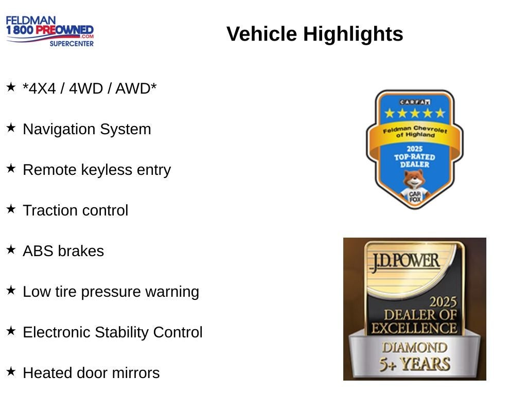 *4X4 / 4WD / AWD*, ABS brakes, Alloy wheels, Compass, Electronic Stability Control, Heated door mirrors, Heated Front Bucket Seats, Heated front seats, Illuminated entry, Leather Seat Trim, Low tire pressure warning, Navigation System, Remote keyless entry, Traction control.