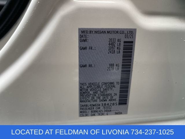 ** LOCATED AT FELDMAN CHEVROLET OF LIVONIA 734-425-6500**This stunning 2025 Nissan Altima 2.5 SV AWD is a true standout in its class. With its sleek exterior design, advanced features, and impressive performance, this vehicle is the perfect choice for the discerning driver.- CLEAN CARFAX*- ONE OWNER CARFAX*- NON SMOKER*- NO ACCIDENTS*- BACKUP CAMERA*- Bluetooth®*- ALL WHEEL DRIVE*- APPLE CARPLAY*- ANDROID AUTO*- FRESH TRADE*Powered by a robust 2.5L 4-Cylinder DOHC 16V engine and equipped with Nissan's advanced Xtronic CVT transmission, this Altima delivers a smooth and responsive driving experience. The all-wheel-drive system provides exceptional traction and control, ensuring you can tackle any road with confidence.Inside, the Altima 2.5 SV AWD offers a spacious and well-appointed cabin, with features like a power driver's seat, dual-zone automatic climate control, and a premium audio system with Apple CarPlay and Android Auto integration. The Blind Spot Warning system and Rear Parking Sensors provide added peace of mind, while the Cloth Seat Trim and 17-inch Machined Alloy Wheels add a touch of style and sophistication.With an impressive EPA-estimated fuel economy of 25 mpg in the city and 34 mpg on the highway, this Altima delivers exceptional efficiency, allowing you to go farther on every tank. The vehicle's well-tuned suspension and speed-sensitive steering provide a comfortable and engaging driving experience, whether you're navigating city streets or cruising down the highway.This 2025 Nissan Altima 2.5 SV AWD is a truly exceptional vehicle that combines style, performance, and advanced technology. We invite you to come and experience it for yourself at Feldman Chevrolet of Livonia. Our knowledgeable sales team is ready to answer any questions you may have and help you find the perfect vehicle to meet your needs.